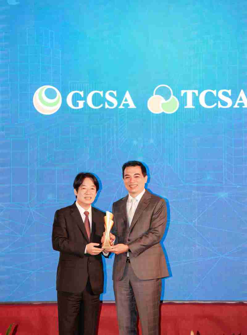 达全方位永续表现获全球永续奖及台湾永续奖肯定,,,由副总统赖清德颁奖 (左),,,918.COM总经理柯富仁 (右) 代表领奖