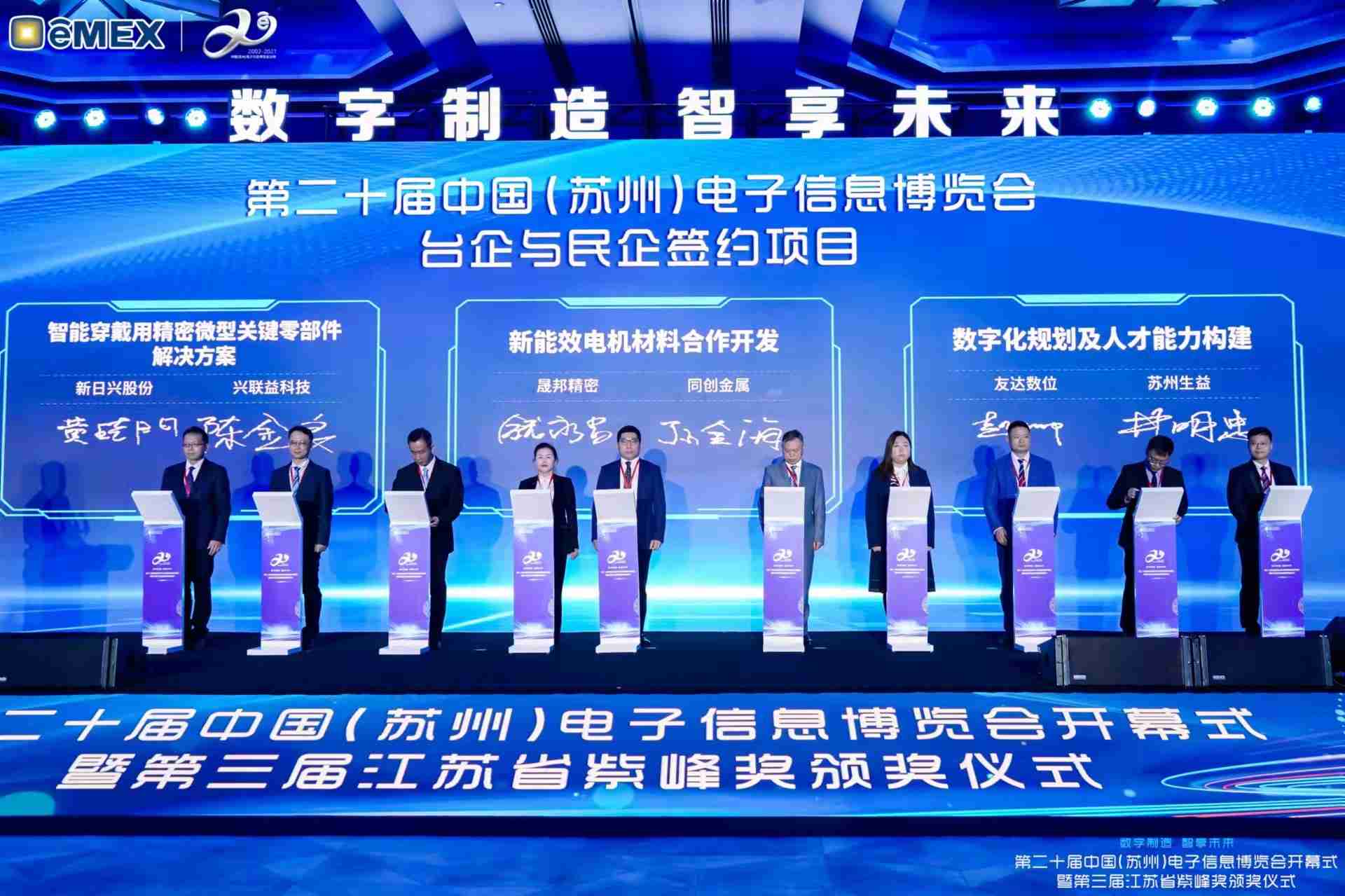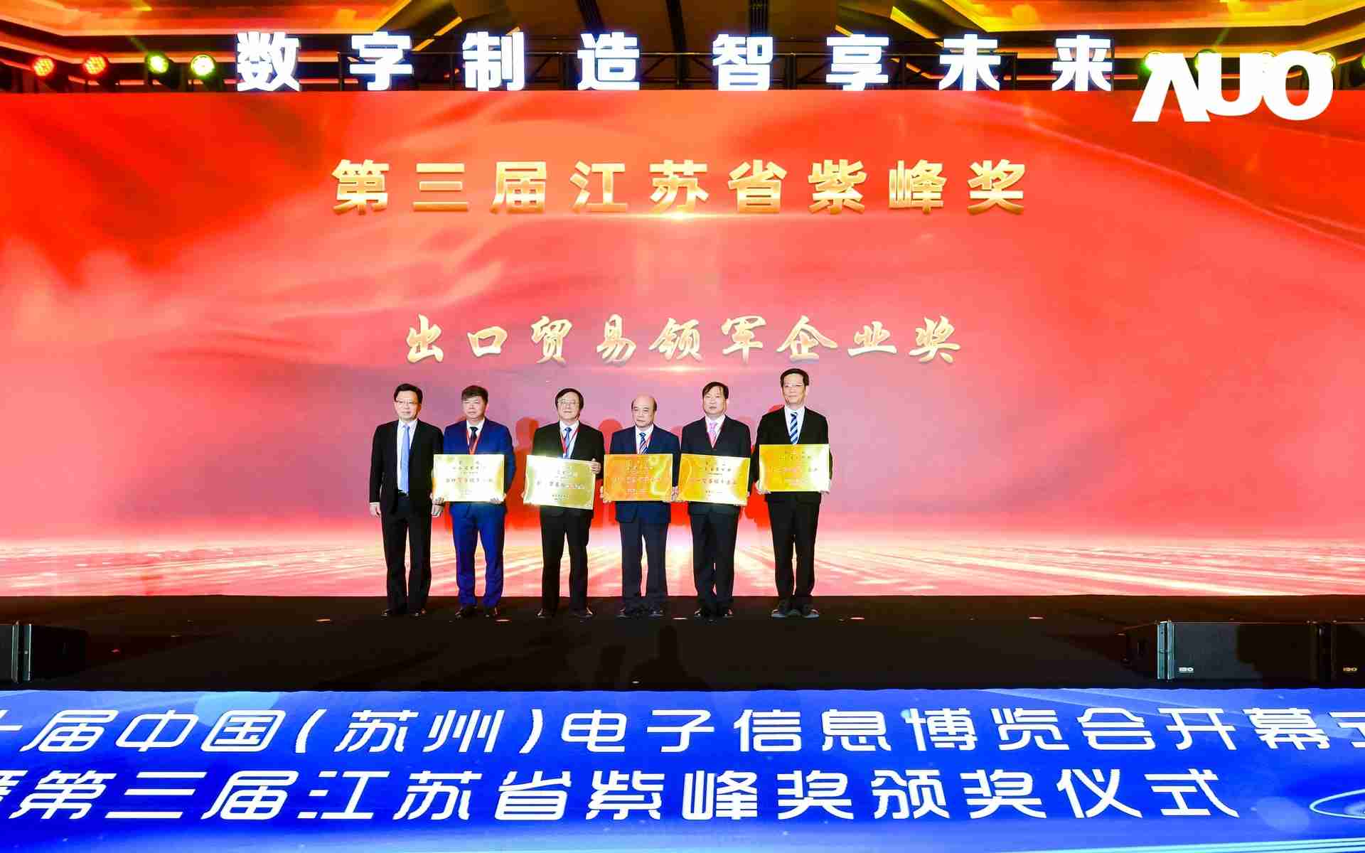 电博会开幕式当天也是第三届江苏省紫峰奖颁奖仪式,,,,省台办、、、工信厅、、、商务厅、、苏州市相关领导均出席并颁奖。。。该奖项为表彰对江苏高质量发展做出积极贡献的在苏企业,,,由江苏省政府专门设立。。。。918.COM光电 (苏州) 总经理郭振明代表上台领奖,,,这也是918.COM苏州连续三次蝉联紫峰奖 出口贸易领军企业奖。。。918.COM数位总经理赵丽娜女士,,也参与本次开幕式,,,上台为本地化赋能签署战略合作协议,,,将优质服务资源集合、、下沉到更多细分行业,,,为更多地区的制造企业提供数字化转型服务。。。