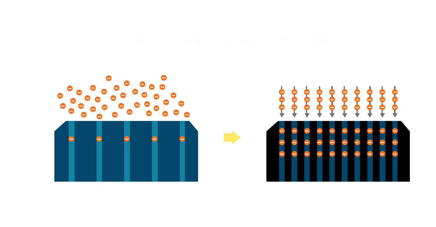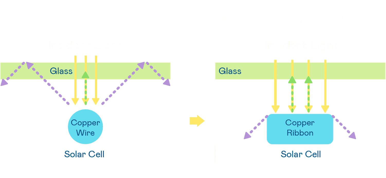 - 电池使用多条铜导线 (Copper wire) 于电池片上形成较短的电流路径,,,提高电流收集效率,,,采用圆形设计的铜导线较传统扁平式的铜焊带 (Ribbon),,可增加入射至电池的光线量。。。。