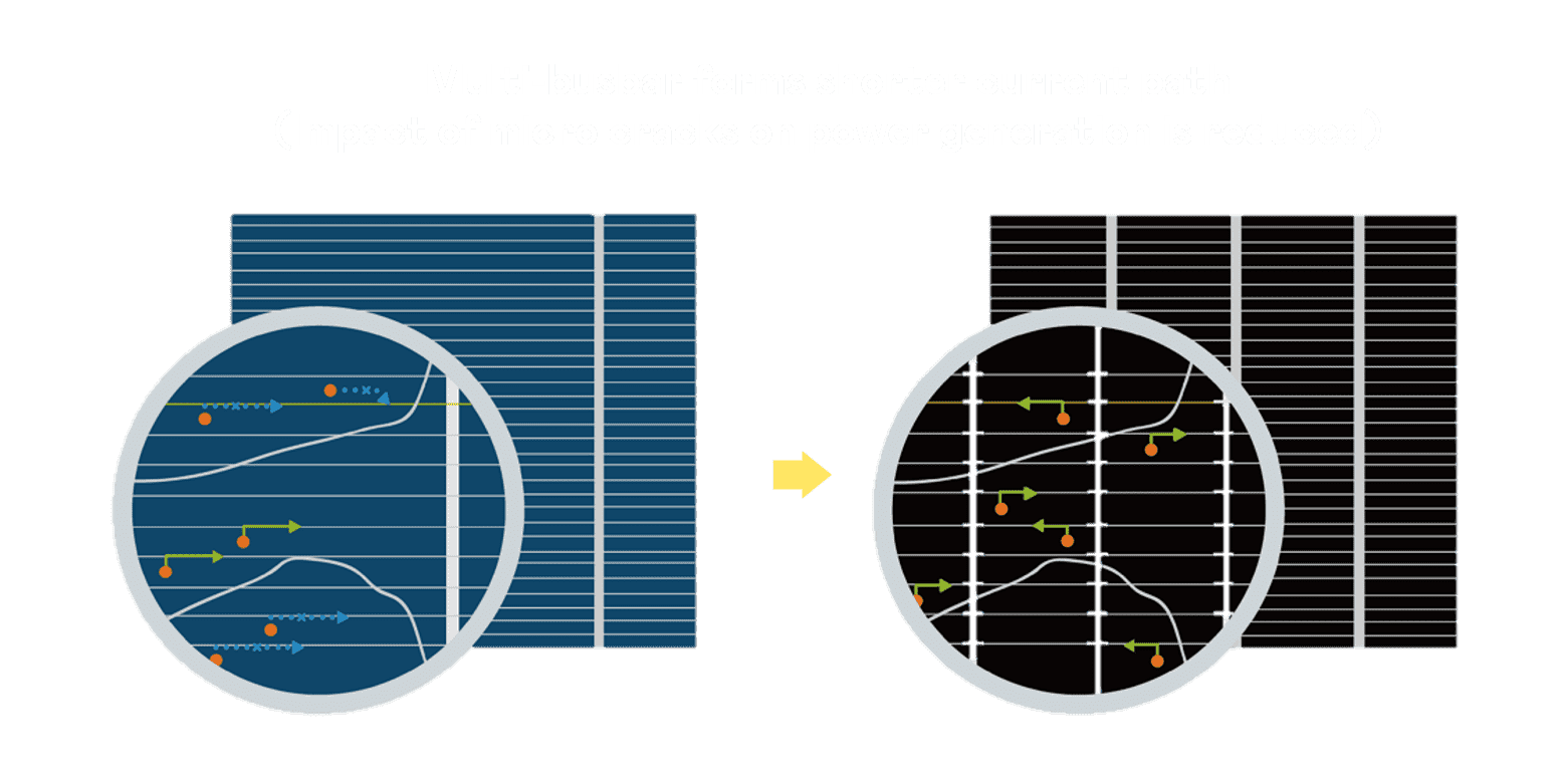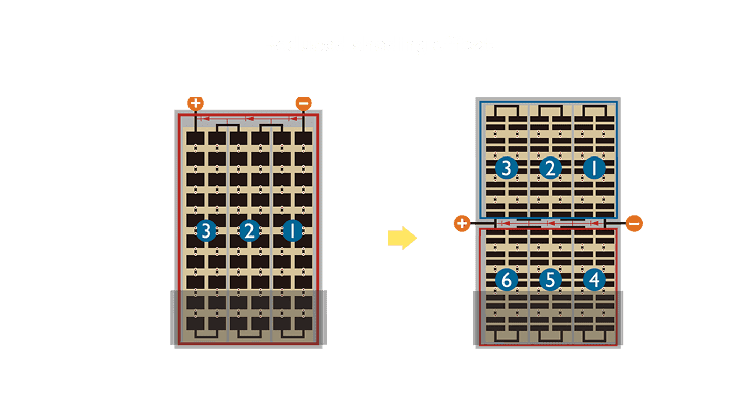 - 结合半切电池,,,降低遮阴影响、、、、提升模组抗隐裂能力、、、、并减少电阻损耗,,,进一步提升模组发电效能。。。。